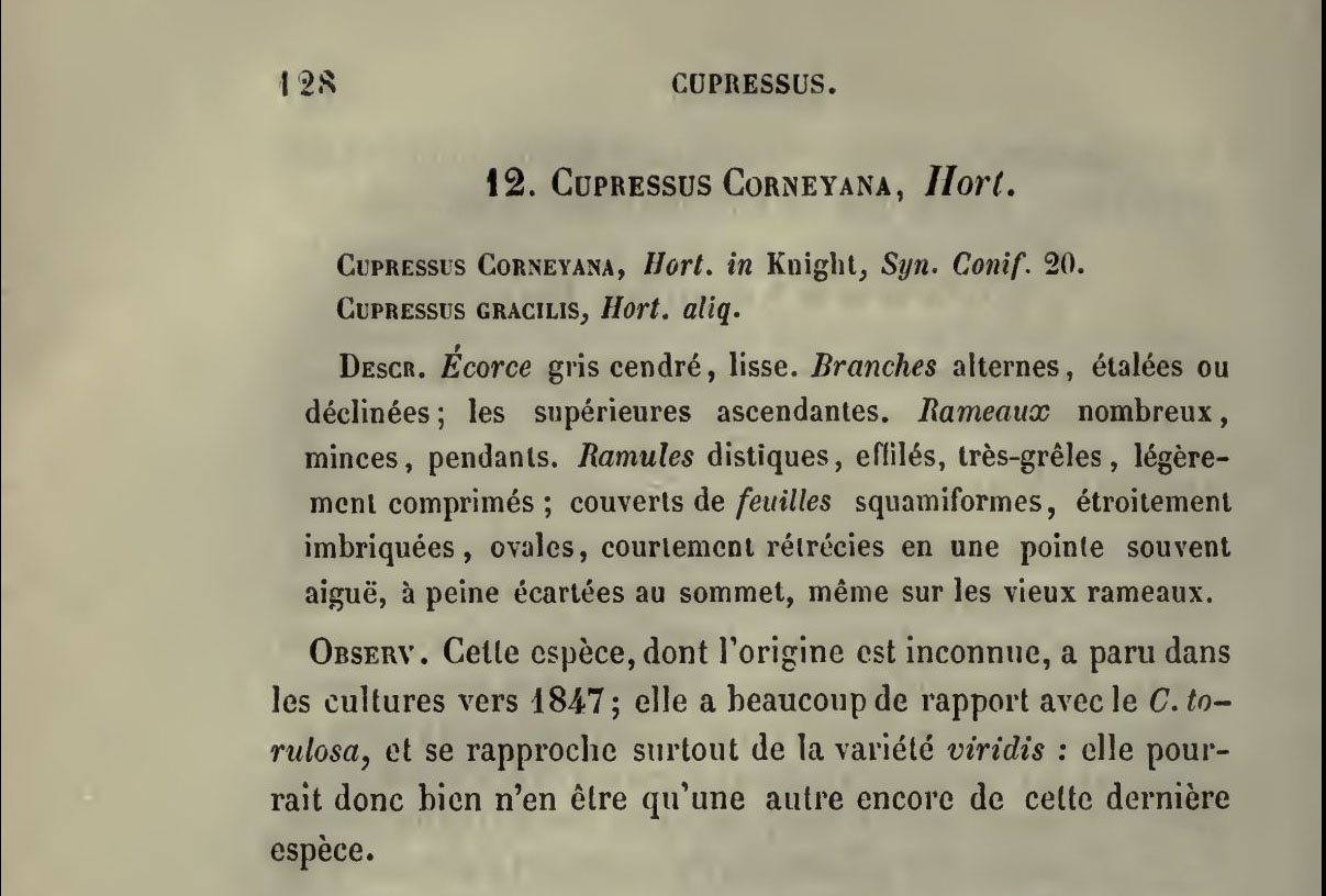CUPRESSUS CORNEYANA, Hort. in Knight, Syn. Conif. 20. CUPRESSUS GRACILIS, Hort. aliq. Descr. Ecorce gris cendré, lisse. Branches alternes, étalées ou