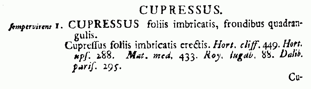 Cupressus foliis imbricatis erectis. Hort. cliff. 449. Hort. ups. 288.