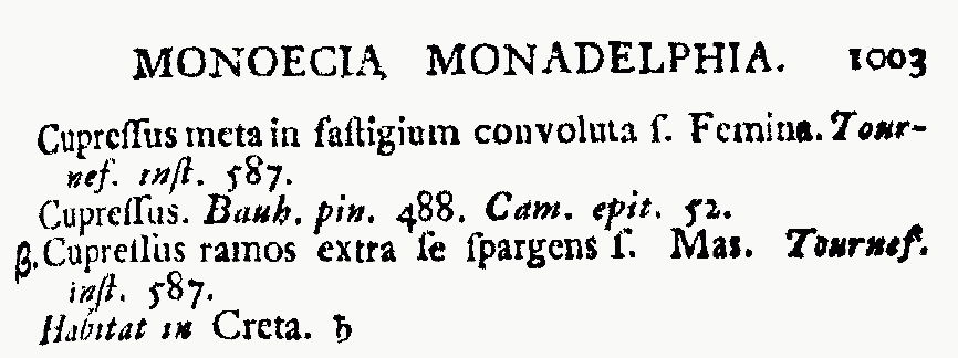 | | Cupressus meta in fastigium convoluta s. Femina. Tournef. inst. 587.